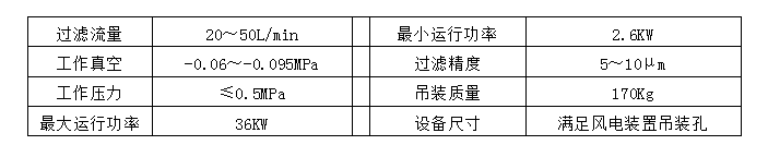 本款設備主要用于風力發電齒輪油處理;由于風力發電處理油箱在高空環境;所以設備制造要求體積小,輕便、方便吊裝,適合于高空作業。